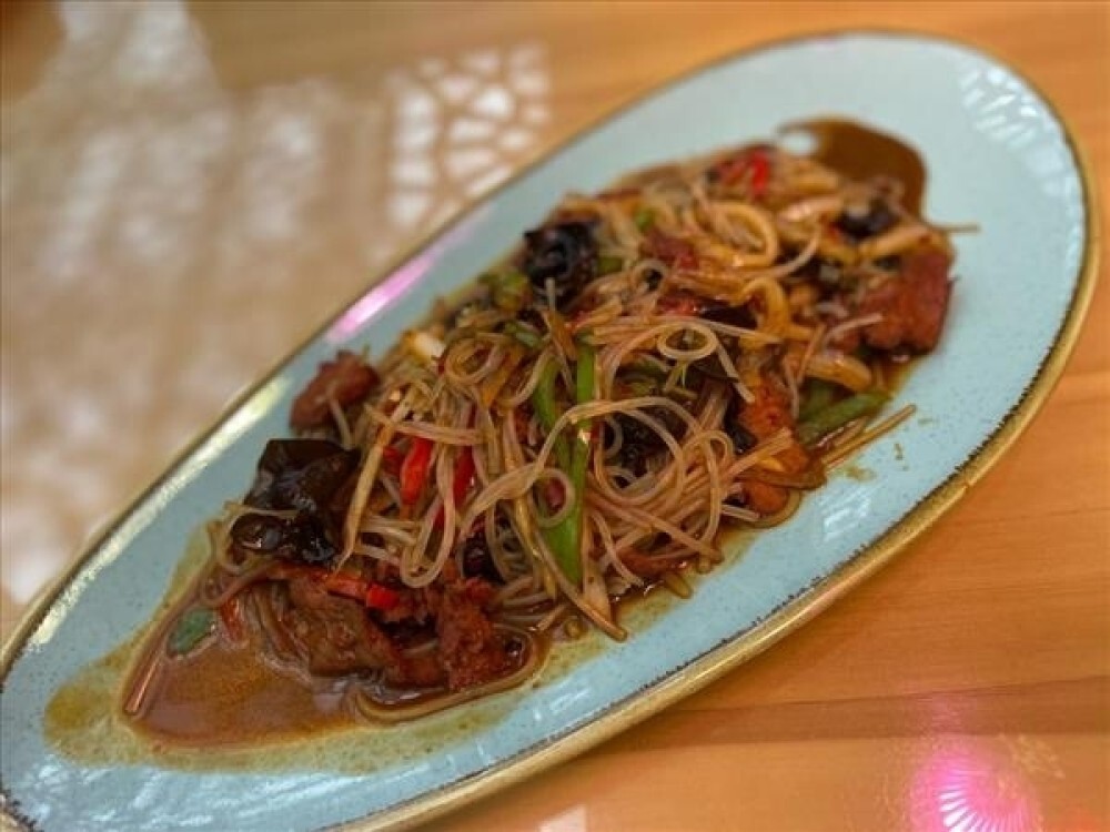 Фунчоза с овощами — нежная фунчоза с маринованной говядиной, древесными грибами, шпинатом и пекинской капустой, обжаренная с полугорьким перцем, чесноком, лапизой и томатной пастой в соусе хаджо. Сытное и ароматное восточное блюдо!