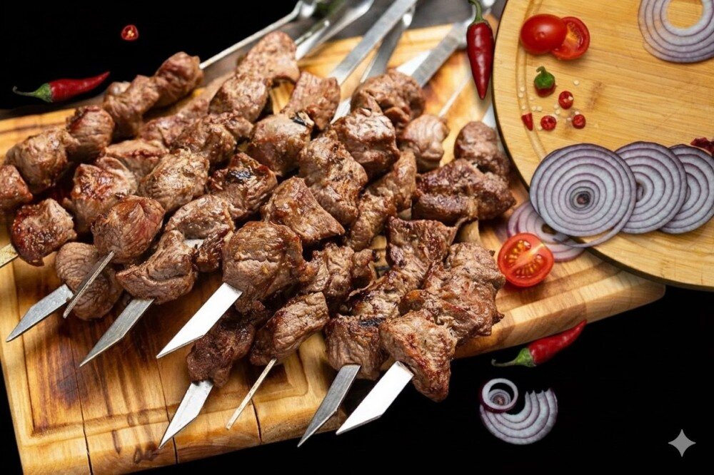 Шашлык из баранины — классика восточной кухни, приготовленная из отборных кусочков молодой баранины. Мясо маринуется в ароматных специях, чтобы сохранить натуральную сочность и раскрыть глубокий вкус. Затем шашлык обжаривается на углях до золотистой корочки, оставаясь мягким и нежным внутри. Подаётся горячим, с луком, и тонким ароматом дымка, который делает блюдо особенно аппетитным.