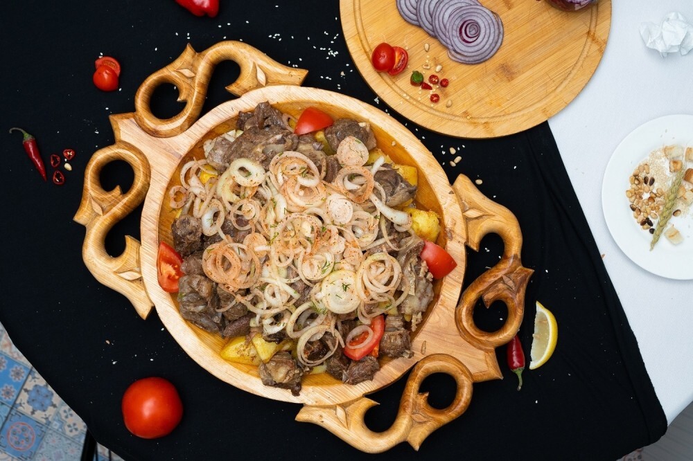 Сырне из баранины Сытное традиционное блюдо из нежной баранины и куырдака, тушённое с картофелем, сладким и острым перцем, чили и ароматной паприкой — сладкой, копчёной и острой. Вкус дополняют свежий укроп и три вида лука: репчатый, красный и зелёный. Блюдо получается насыщенным, пряным и по-домашнему тёплым — идеальный выбор для ценителей восточной кухни.