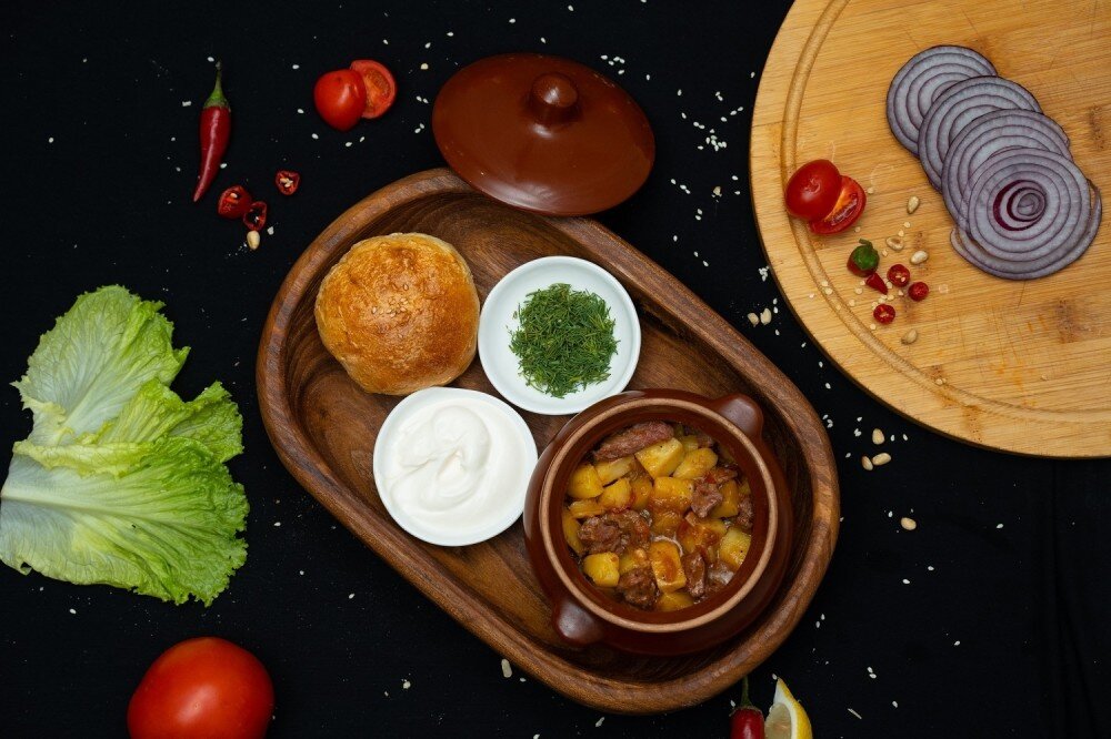 Жаркое с говядиной в горшочке — это уютное домашнее блюдо, приготовленное в традиционном керамическом горшочке. Нежная говядина тушится до мягкости вместе с картофелем, репчатым луком, помидорами и чесноком, постепенно насыщаясь сливочной массой и ароматами овощей. Зелёный лук добавляет свежесть и мягкую пикантную нотку. Подаётся жаркое со сметаной, ароматной чесночной помпушкой и свежим укропом, создавая гармоничное и согревающее сочетание.