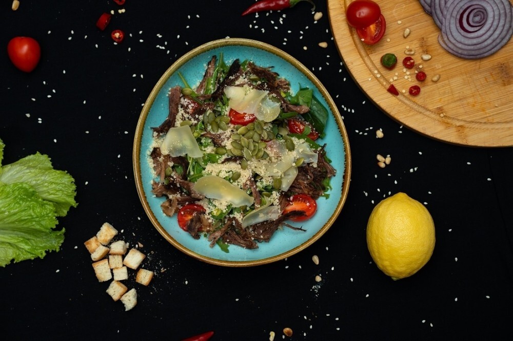 Салат с томлёной говядиной — сытный и в то же время лёгкий: сюда входят свежая, чуть острая по вкусу руккола, сочные помидоры черри и нежная томлёная говядина, мягкая и ароматная после долгого приготовления. Салат заправлен густыми сливками, присыпан щедрой порцией тёртого сыра пармезан — что придаёт блюду сливочно-сырный, немного пикантный характер. А тёмно-зелёные, хрустящие тыквенные семечки дарят приятный контраст текстур: хрустящие, немного ореховые — в гармонии с мягкостью мяса и нежностью сливок.