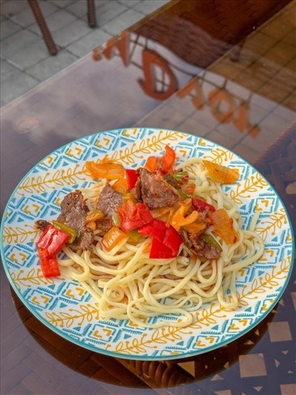Лазыру Лагман — острый лагман с маринованной говядиной, обжаренной с луком, свежим чесноком, полугорьким перцем, лапизой и томатной пастой на тесте для лагмана. Яркое, пряное и сытное восточное блюдо!