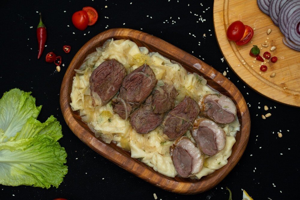 Бешбармак — это традиционное казахское блюдо, приготовленное из мягкого отварного теста и ароматного мяса. В составе используются казы и жая, которые дают насыщенный, глубокий вкус. Репчатый лук и картофель делают блюдо ещё более сытным, а чёрный молотый перец подчёркивает его аромат. Зелёный лук добавляет свежую нотку и лёгкую хрусткость. Подаётся бешбармак со свежим лимоном, и айраном, что создаёт гармонию вкусов и делает блюдо по-настоящему традиционным и праздничным.
