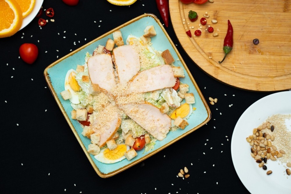 Салат «Цезарь с курицей» — популярное классическое блюдо с лёгким вкусом и идеальным балансом текстур. Основу салата составляет хрустящий салат айсберг, который гармонично сочетается с сочными помидорами черри и нежным куриным филе. Фирменный соус «Цезарь» придаёт блюду насыщенный сливочно-чесночный вкус, а золотистые сухарики добавляют приятный хруст. Тёртый пармезан подчёркивает вкус соуса, делая его более выразительным, а куриное яйцо делает салат мягче и нежнее. В результате получается лёгкий, яркий и сытный салат, который подходит как для обеда, так и для ужина
