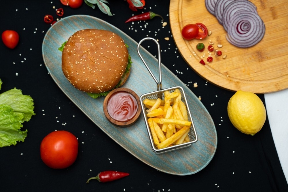 Бургер с курицей — это сытное и ароматное блюдо с сочной куриной котлетой, свежими овощами и соусом по вашему вкусу, аккуратно собранное в мягкую булочку. Подаётся с хрустящим картофелем фри, создавая идеальное сочетание текстур и вкусов для полноценного обеда или перекуса.