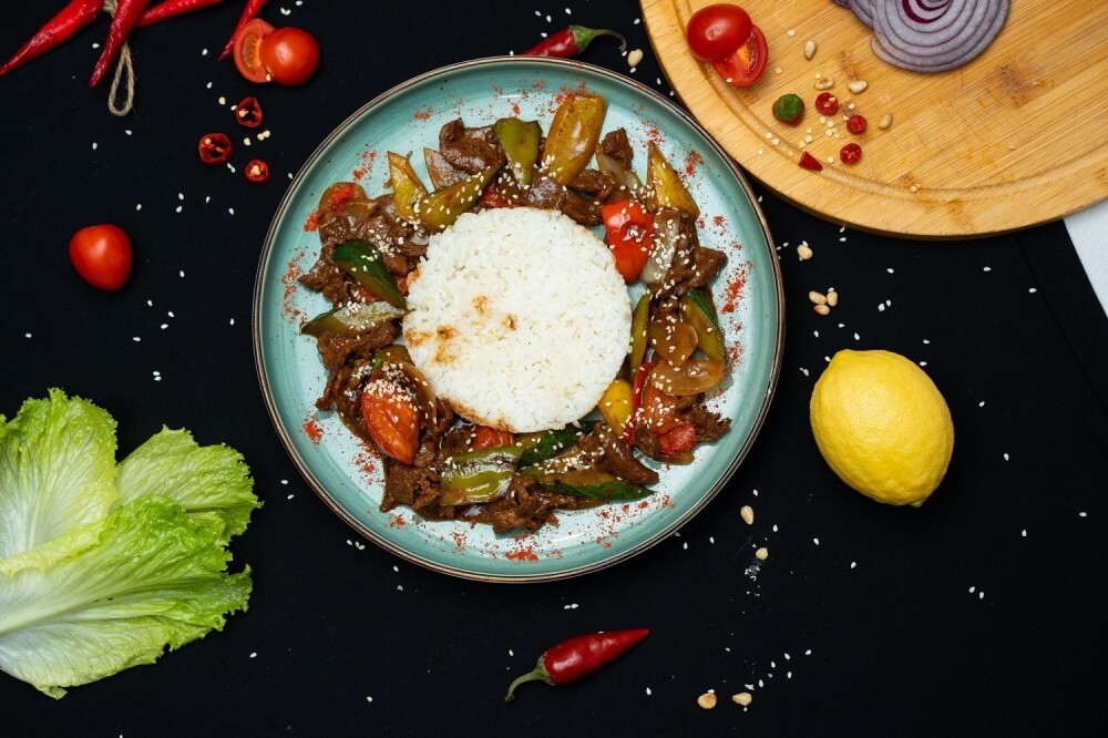 Мясо по-тайски — это ароматное блюдо с нежной говядиной, обжаренной с луком, чесноком,помидорами, огурцами и свежим перцем. Соевый соус придаёт насыщенный солёно-сладкий вкус, подчёркивая свежесть овощей и пикантность специй. Подаётся с рассыпчатым рисом и посыпается кунжутом, создавая гармоничное сочетание текстур и ароматов в каждом кусочке.