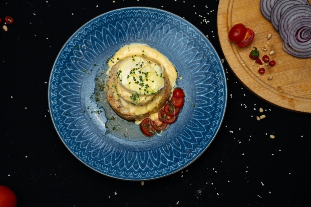 Куриный бифштекс с яйцом пашот — это сытное и нежное блюдо, где сочная котлета из куриного фарша соединяется с расплавленной сырной котлетой, создавая гармоничное сочетание текстур. Сверху подаётся яйцо пашот и сливочное масло, которые добавляют мягкость, аромат и нежность, делая каждый кусочек особенно вкусным.