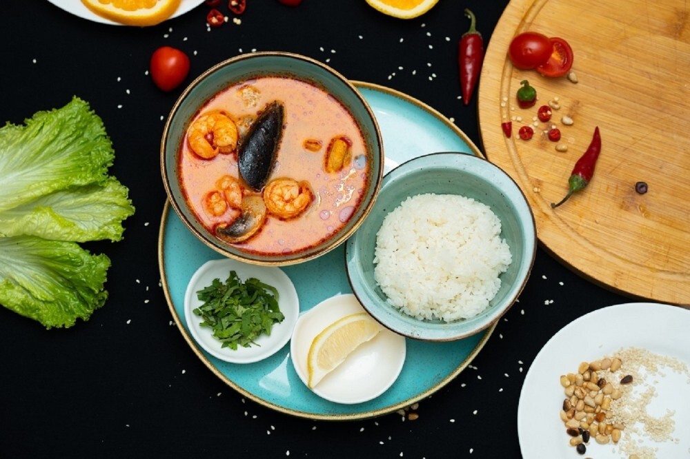 Том ям с морепродуктами — ароматный и пряный тайский суп, приготовленный на основе насыщенной том ям пасты и нежного кокосового молока. В его составе — сочные креветки, мидии и морской коктейль, шампиньоны и сладкие помидоры черри. Подаётся с горячим рисом, ароматной кинзой и долькой свежего лимона, который подчёркивает яркий вкус блюда.