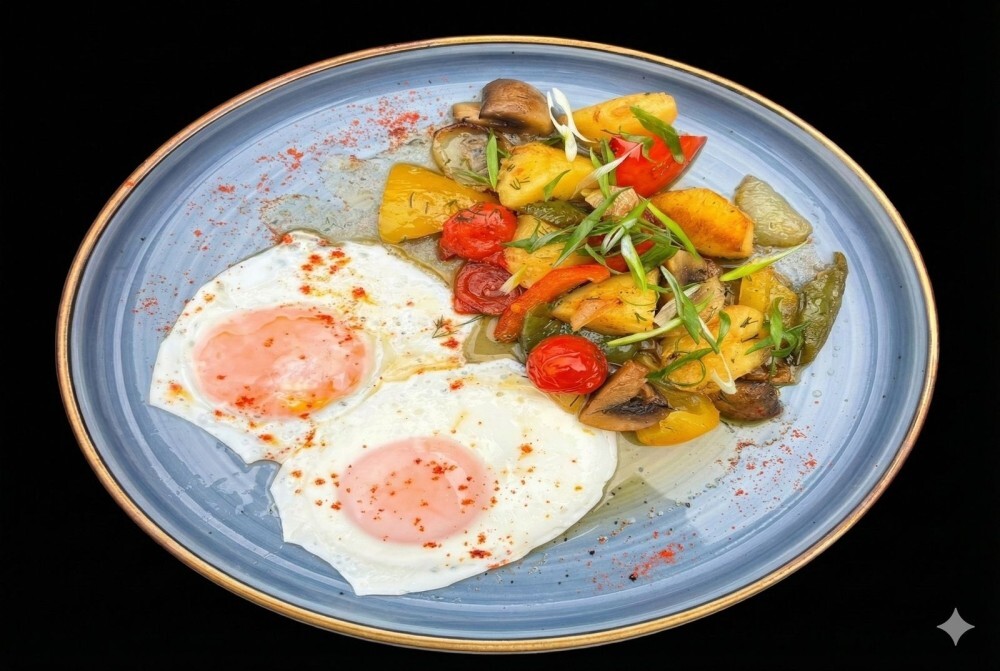 Глазунья с овощами — сытное и яркое блюдо, в котором нежное яйцо гармонично сочетается с картофелем, кабачками, шампиньонами, сладким болгарским перцем и сочными помидорами черри. Обжаренные до золотистой корочки овощи сохраняют свежесть и насыщенный вкус, а глазунья добавляет мягкость и нежность. Подаётся горячим, создавая яркую и ароматную композицию на тарелке.