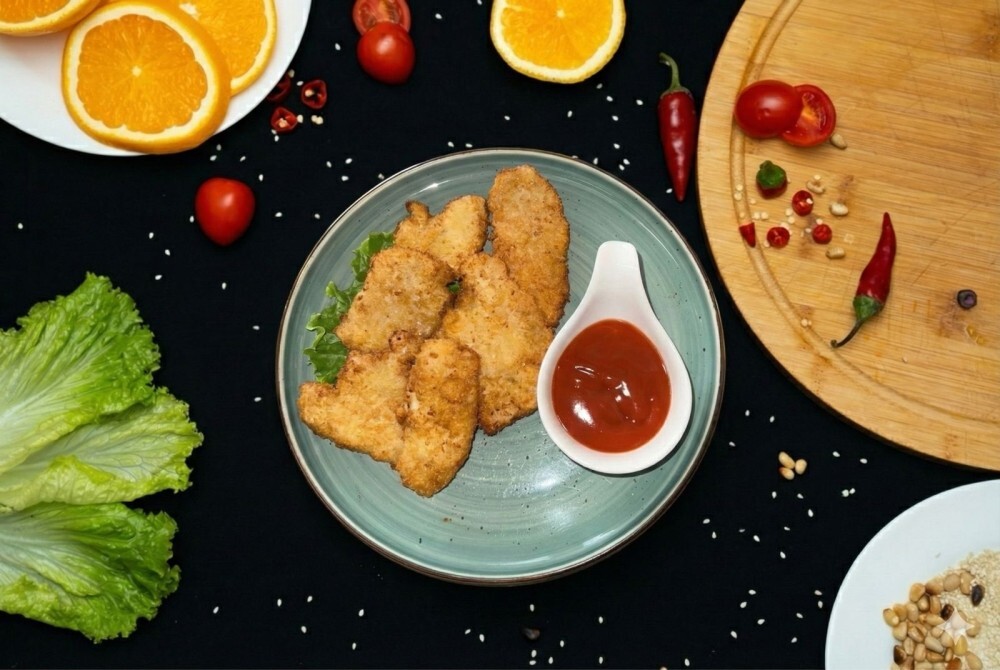 Наггетcы нежные кусочки куриного филе в хрустящей золотистой панировке. Снаружи — идеальная корочка, которая приятно хрустит, а внутри — сочное и мягкое мясо.