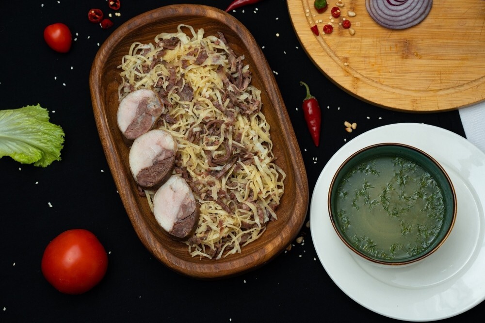 Нарын из конины – традиционное восточное блюдо с нежной кониной и сочным жая , тонкое тесто приготовленное в ароматном бульоне. Подаётся с освежающим айраном, долькой лимона и свежим зелёным луком, добавляющими блюду яркую свежесть и лёгкую кислинку. Идеально подходит для сытного и аутентичного обеда.