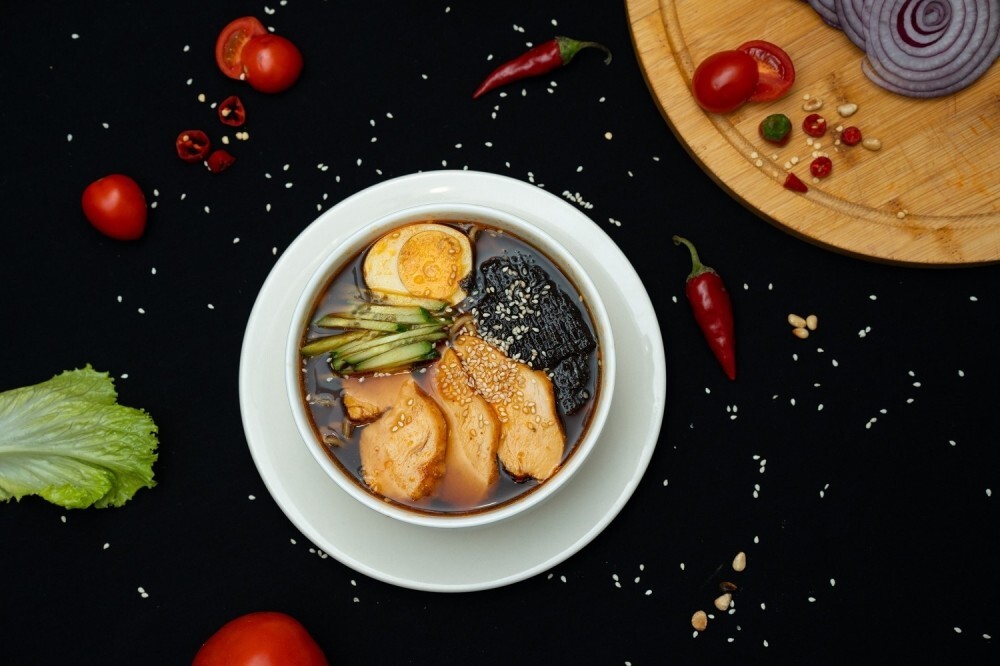Рамён с курицей – насыщенный и ароматный суп на основе фирменного рамёна, приготовленный с добавлением сливочного масла и соевого соуса. Нежная курица, шампиньоны и грибы создают глубокий, богатый вкус, который дополняют яйцо, хрустящие водоросли нори и кунжут. Свежий зелёный лук придаёт лёгкую остроту и свежесть. Сытное и согревающее блюдо, идеально подходящее для ценителей азиатской кухни.