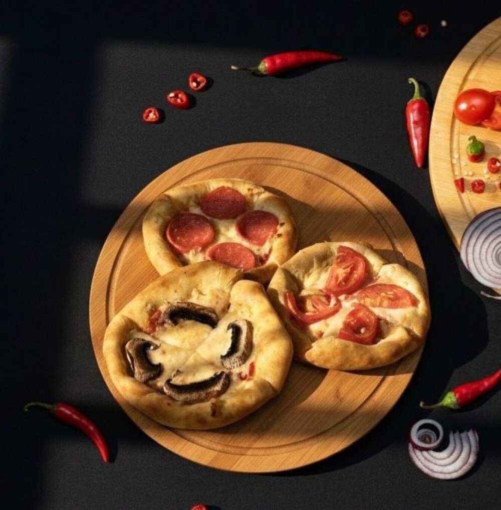 Сет из мини пицц это идеальная подборка из трёх любимых вкусов: Маргарита, Пепперони и С грибами. Маленькие, аккуратные пиццы приготовлены на тонком тесте и запечены до лёгкой золотистой корочки.