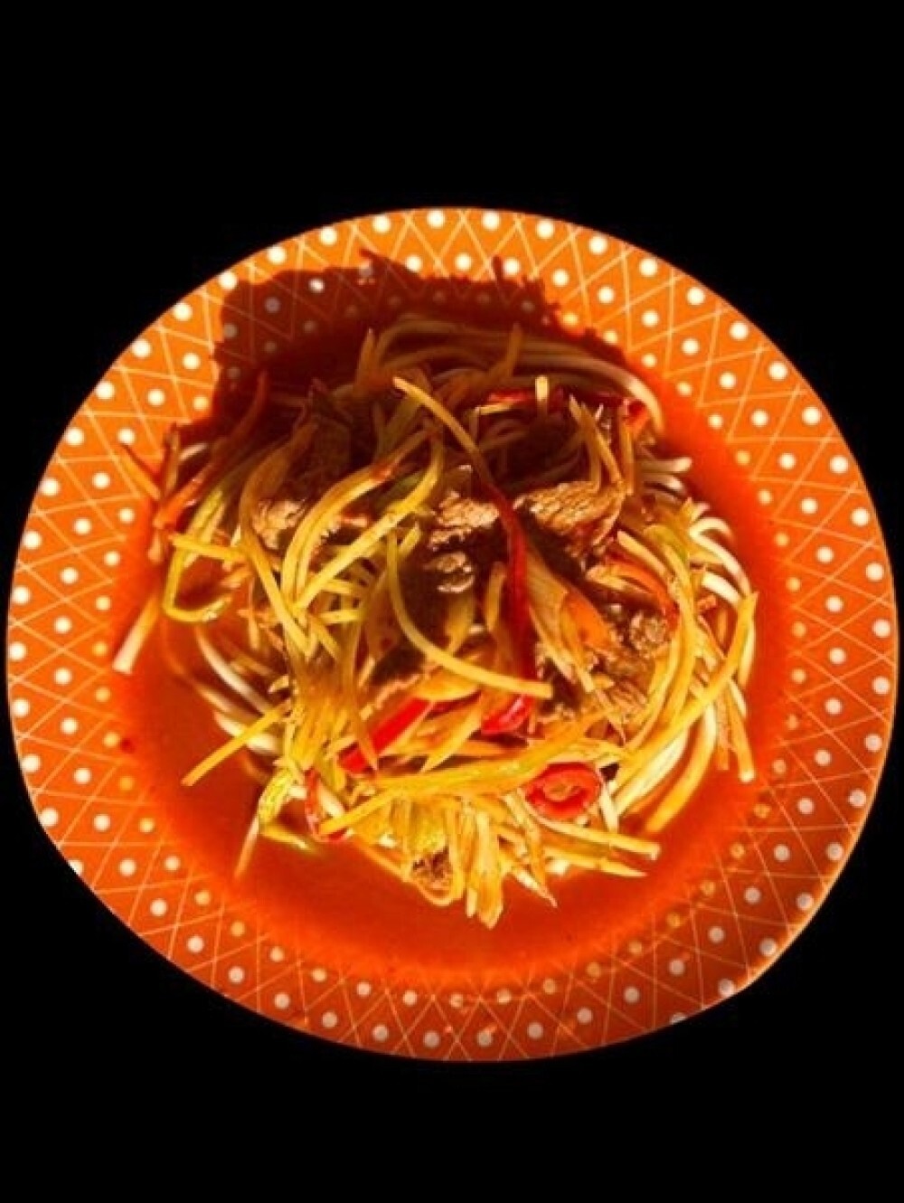Тудысыр Лагман — лагман с маринованной говядиной и картофелем, нарезанным соломкой, обжаренный с полугорьким перцем, свежим чесноком, лапизой и томатной пастой в соусе хаджо на тесте для лагмана.