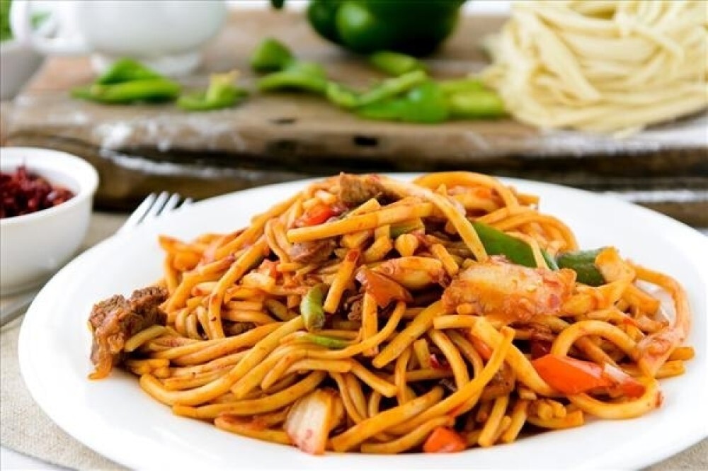 Гуйру цомян — это ароматный жареный лагман, приготовленный из тянущегося лагманного теста и нежной говядины. Овощи — полугорький перец, свежие помидоры, лук, бассай и лапиза — создают яркий, насыщенный вкус, а чеснок добавляет лёгкую пикантность. Сельдерей придаёт блюду свежий аромат и приятную хрустящую нотку. Обжаренные вместе ингредиенты образуют гармоничное сочетание, делая гуйру цомян сытным, ароматным и по-восточному богатым на вкус.
