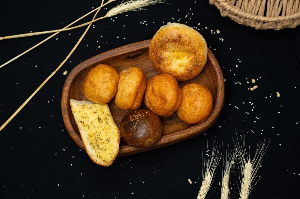 Хлебная корзина — это разнообразие свежих и ароматных хлебобулочных изделий для идеального начала трапезы. В состав входят маленькая домашняя лепёшка, лёгкий и хрустящие бауырсаки, насыщенный вкусом хлеб солодовый, а также багет с чесноком и сливочным маслом, создающий тёплую, сливочную нотку. Каждое изделие в корзине дополняет друг друга, даря богатый хлебный вкус и уютную атмосферу.